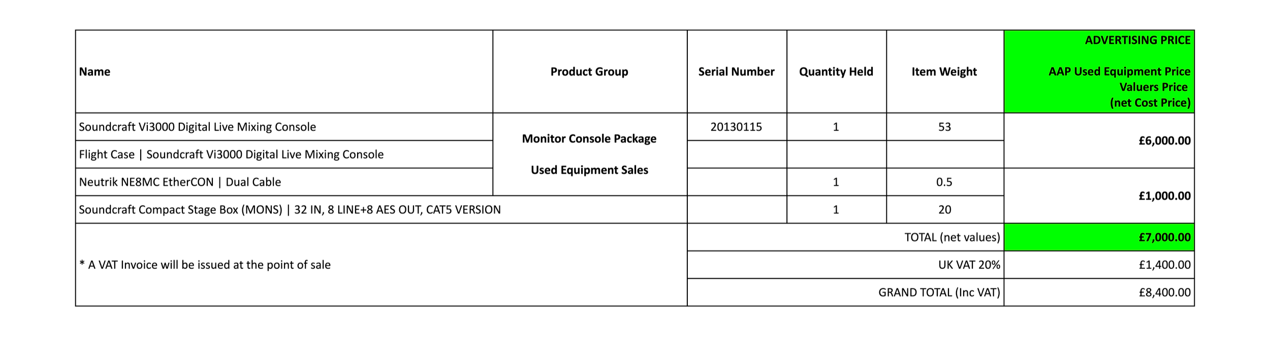 Total of listing £7,000.00 + VAT = £8,400.00 including VAT *